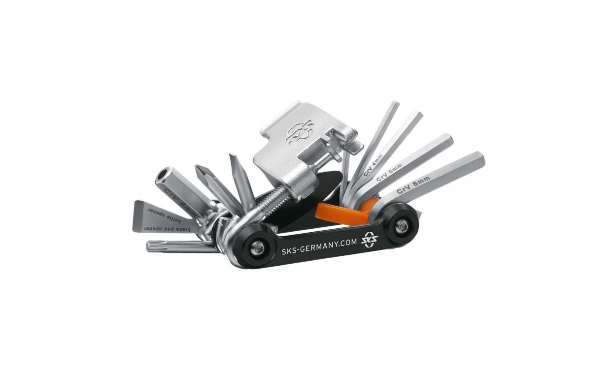 Компактный полностью металлический мини-инструмент - это прекрасный аксессуар для любого велосипедиста. Благодаря своим небольшим размерам он поместится в кармане веломайки и в любой подседельной сумке. Комплект из 18 инструментов поможет справиться почти с любой проблемой. Интегрированное отделение для пина цепи – это лишь одно из многих достоинств этого компактного набора инструментов.