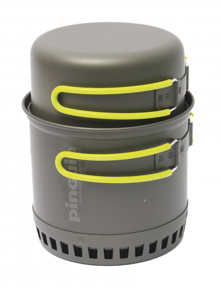 Набор посуды Pinguin Double X - две кастрюли с двумя глубокими крышками, большая из которых оснащена теплообменником из алюминия с анодированной поверхностью. Складные ручки изготовлены из стальной проволоки, снабженной термостойкой силиконовой защитой.