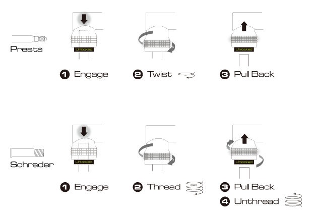 - Простота переключения между Presta и Schrader.