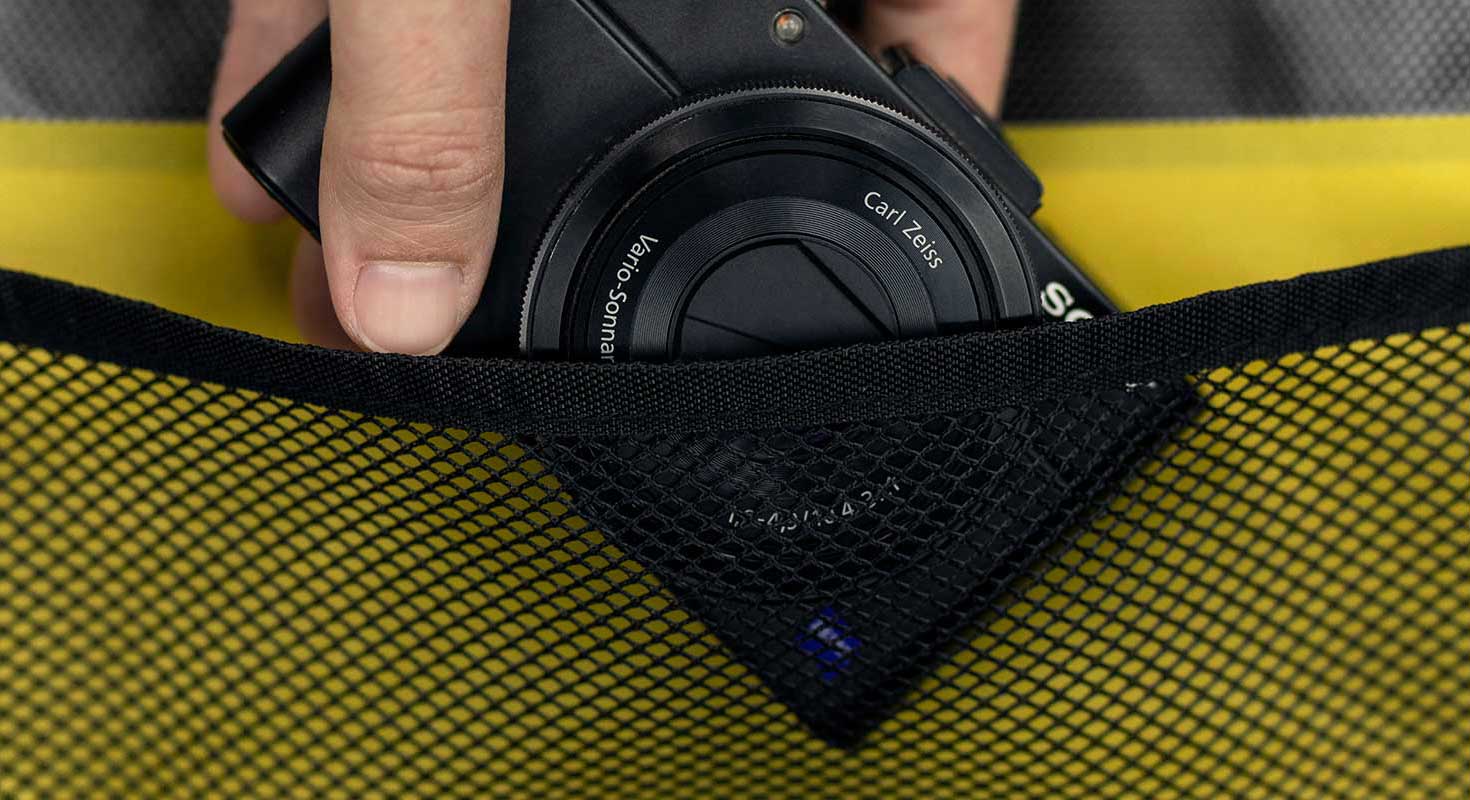 Водостойкая застёжка открывается и закрывается одним пальцем. Светоотражающие элементы сделают вас видимыми для автомобилей в тёмное время суток. Внутри имеется сетчатый карман для организации вещей, жёлтая внутренняя прокладка облегчает поиск мелких вещей.